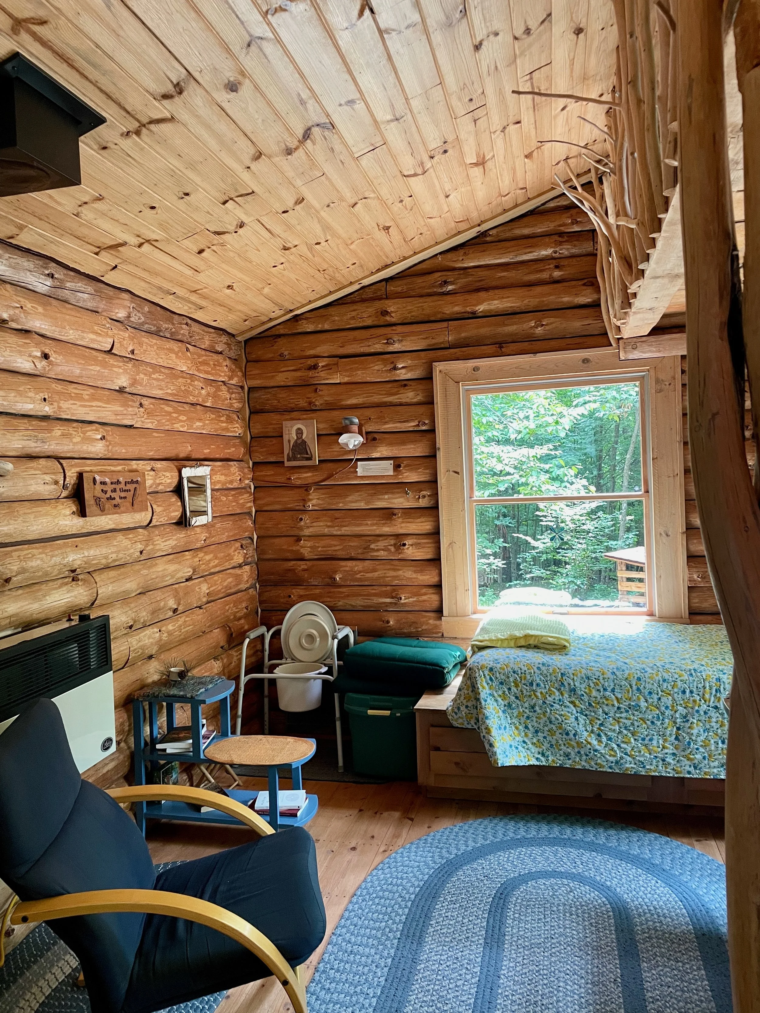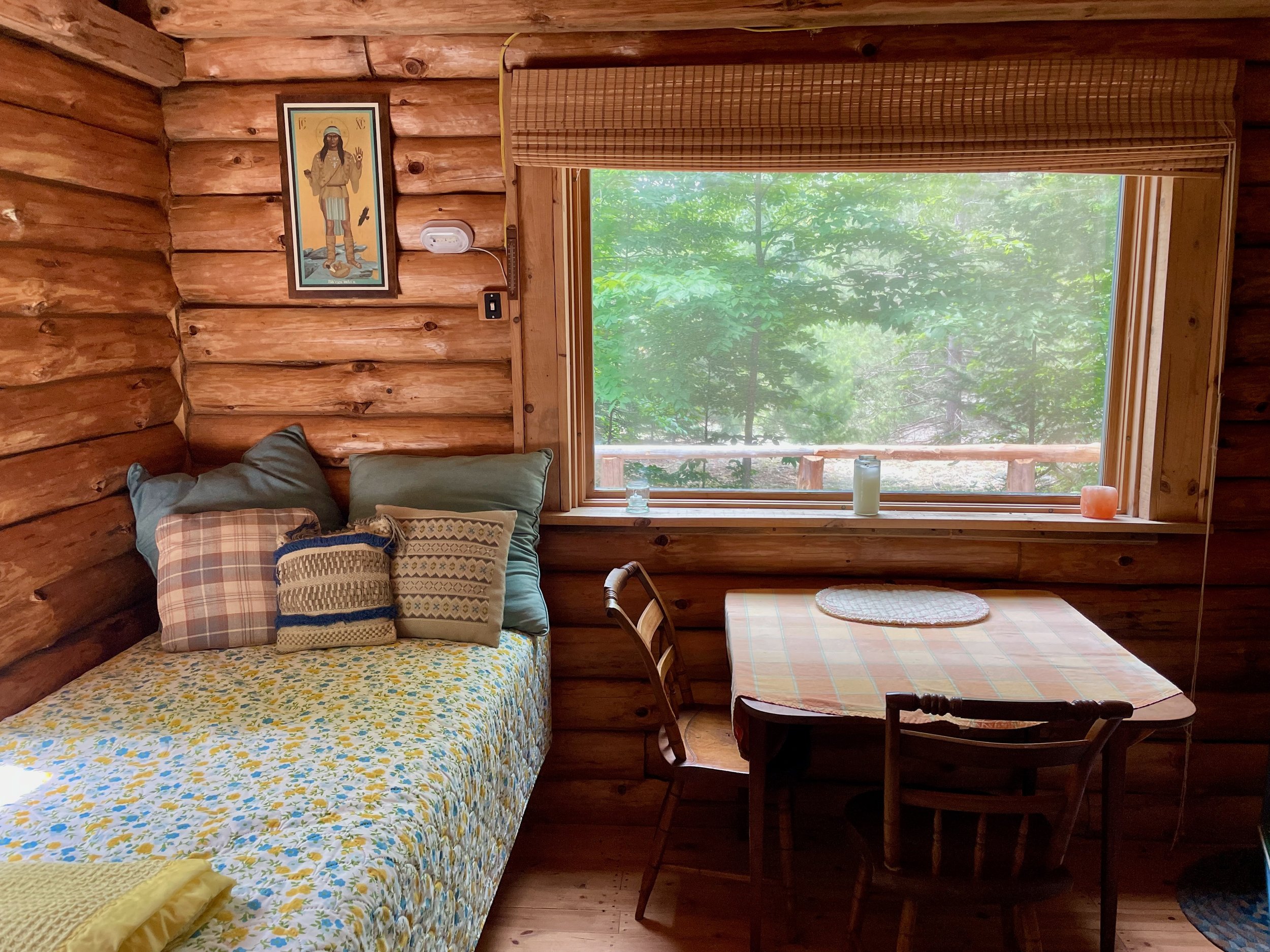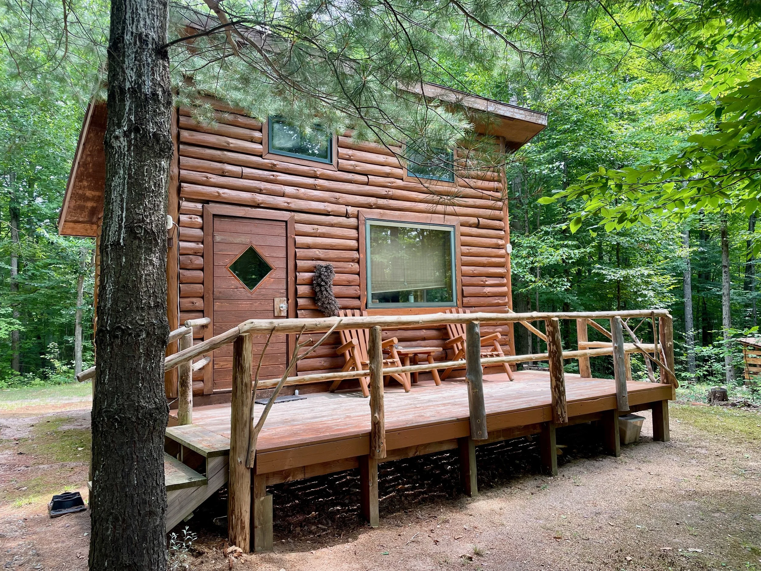 A log cabin with large windows and a loft, Kay Blue sits on the edge of a clearing with a large front deck. It sleeps 1-2 people.