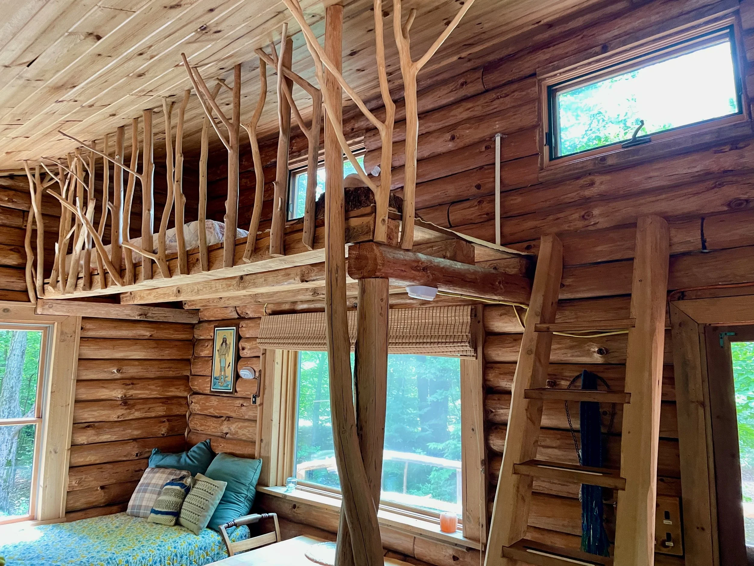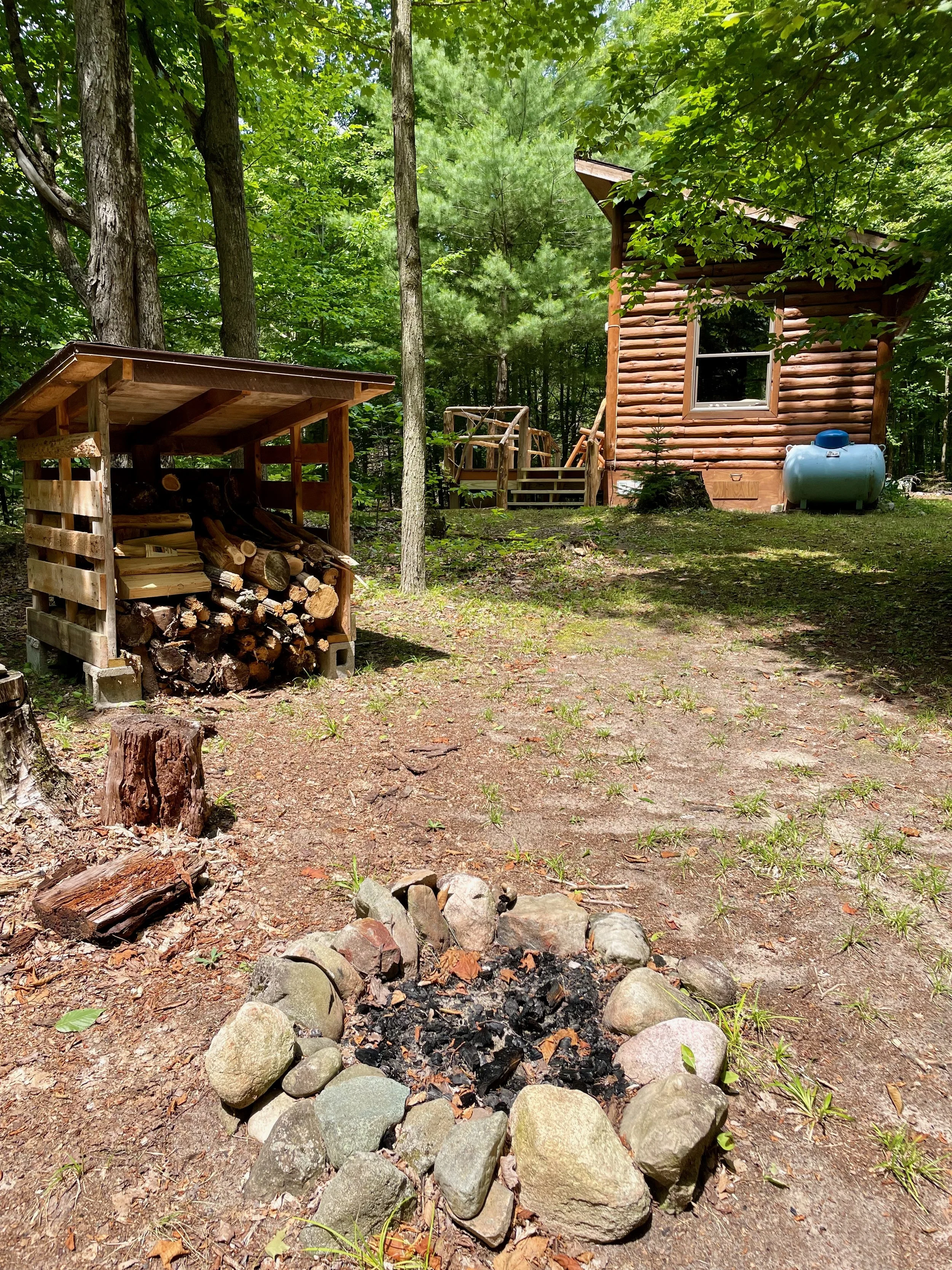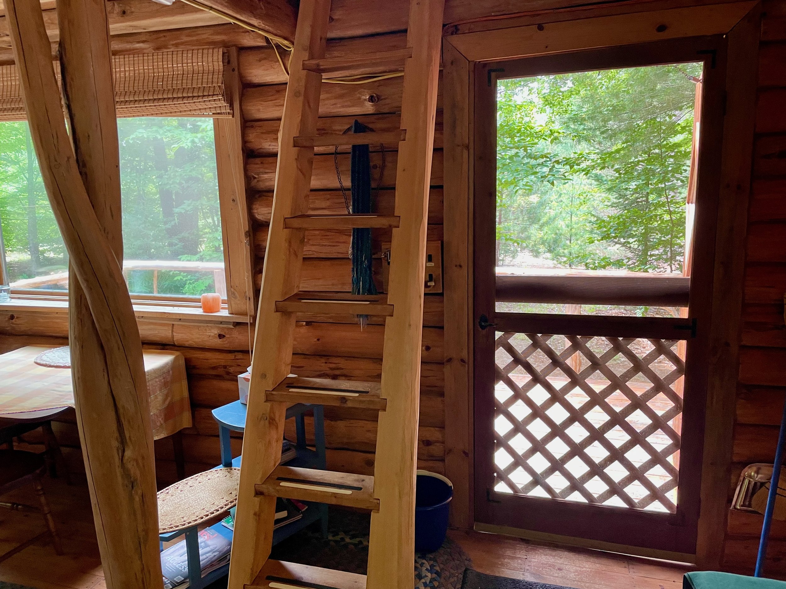A log cabin with large windows and a loft, Kay Blue sits on the edge of a clearing with a large front deck. It sleeps 1-2 people.