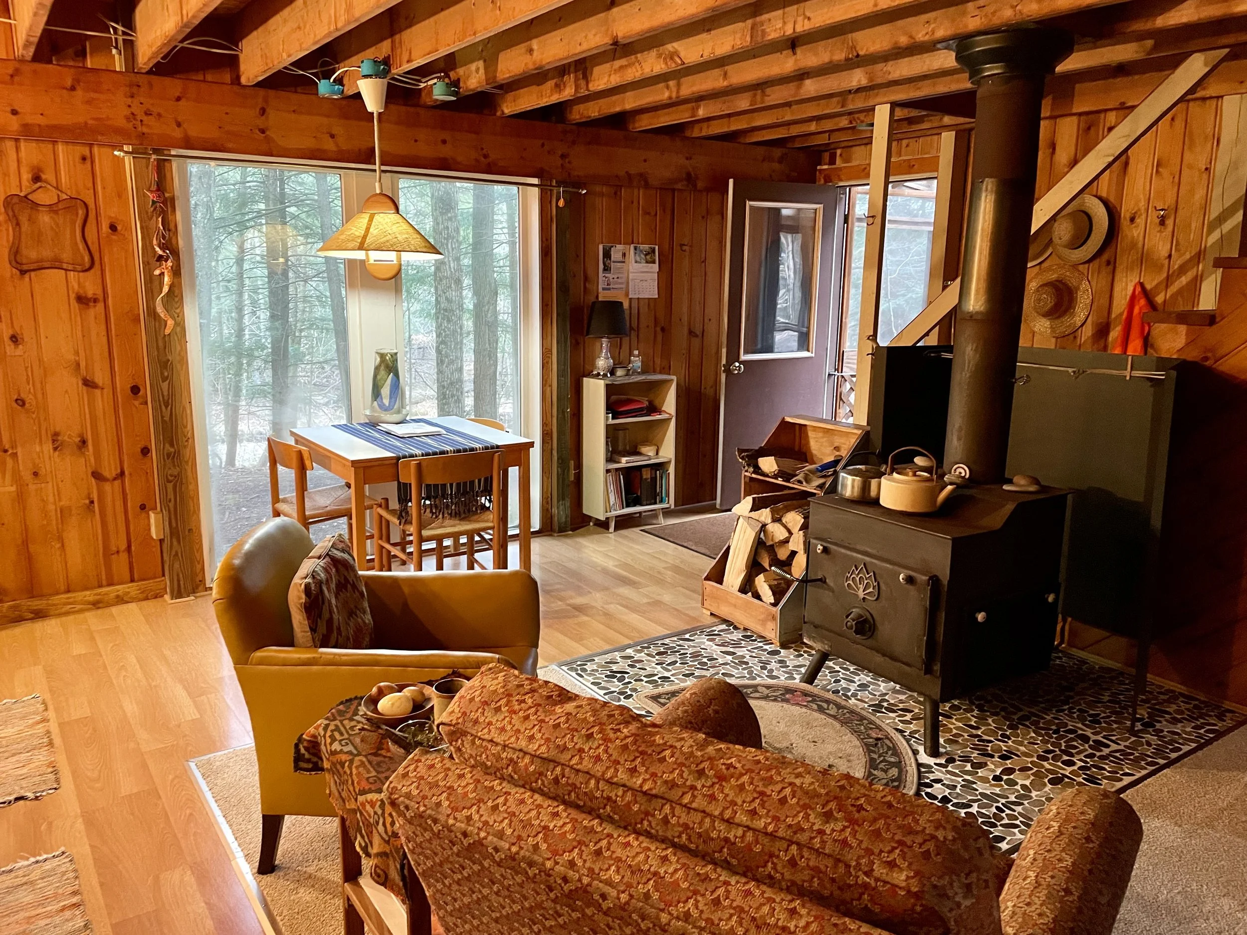 Available for short or sabbatical retreats, Morning Glory sits nestled in hemlocks overlooking Hersey creek, and sleeps up to 6 people. Morning Glory is our biggest cabin with the most amenities, so she’s great for families, or a hub for your group retreat. She also has our newest outhouse, constructed fall of 2025!